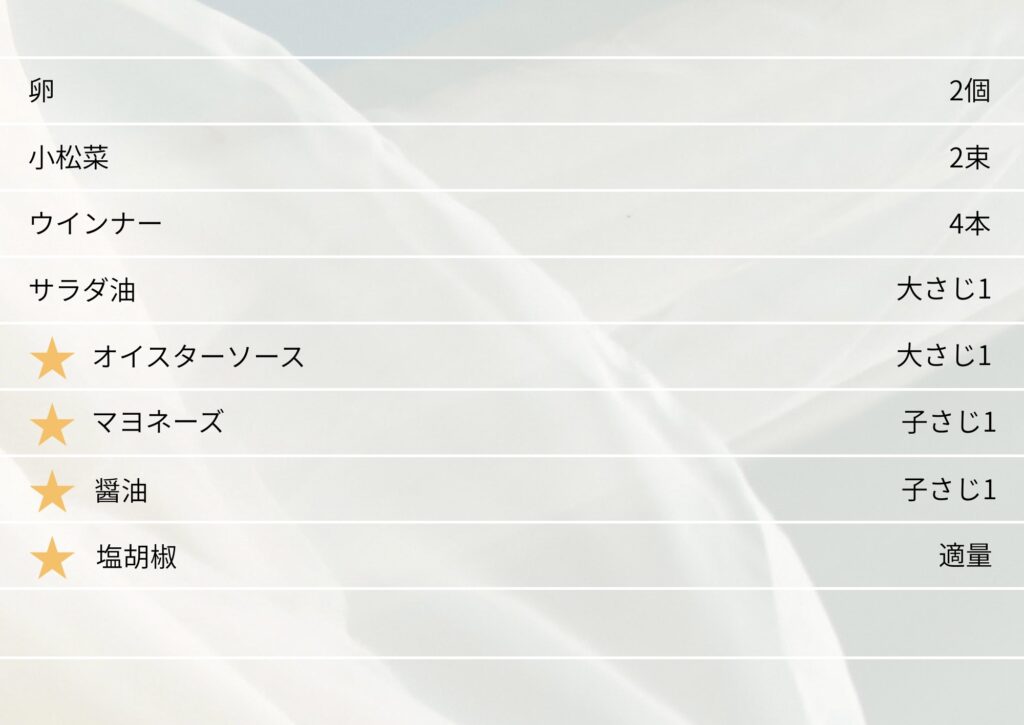 今回のレシピは冷蔵庫に大体はある卵・ウインナーを使った簡単レシピ♪葉物野菜は小松菜を使用していますが、ほうれん草やチンゲン菜などでも美味しくできます!葉物野菜とウインナーなら包丁とまな板を使用せずに調理用はさみだけで切ることができるので洗い物も少なく時短で作ることができるのであと一品!というときに最適なレシピになっています!